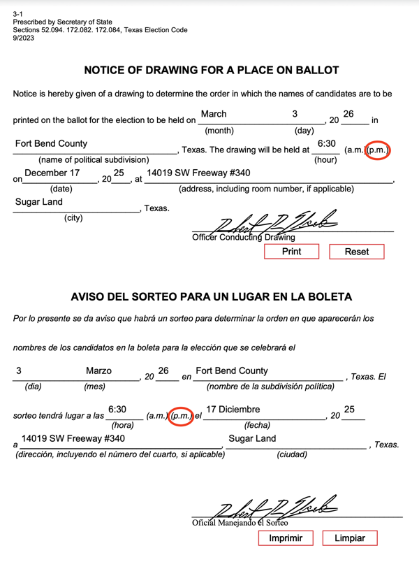 If you are a candidate in a contested race on the March 3, 2026 primary ballot, please come out to this event to draw for your position on the Fort Bend County ballot. All positions for all contested races will be determined at this time. If you or your designee are not present, your ballot position will be drawn for you.