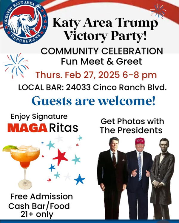 Greater Katy Area RepublicansDate February 27, 2025Time 6:00 PM - 8:00 PMVenue Local BarLocation 24033 Cinco Ranch Blvd., Katy, TX, 77494, Venue Google Map Link + Google MapOrganizer Greater Katy Area Republicans