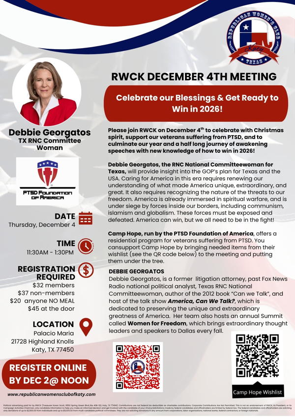 RWCK December MeetingDate December 4, 2025Time 11:30 AM - 1:30 PMVenue Palacio MariaLocation 21728 Highland Knolls, Katy, TX, 77450, Venue Google Map Link + Google MapOrganizer Republican Women’s Club of KatyOrganizer Website View Organizer Website